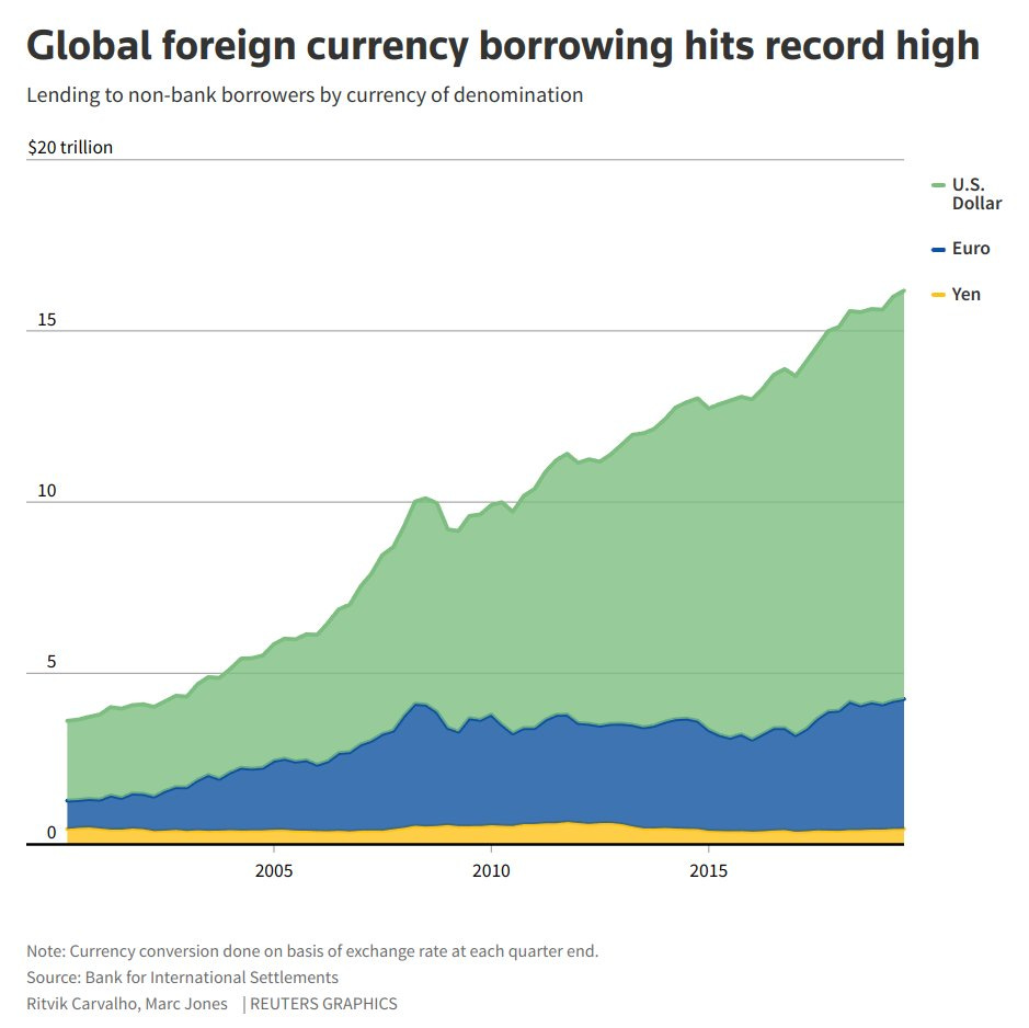 The majority of current debt (including bonds) is denominated in USD. This is also one of the reasons why USD remains the primary reserve currency.
