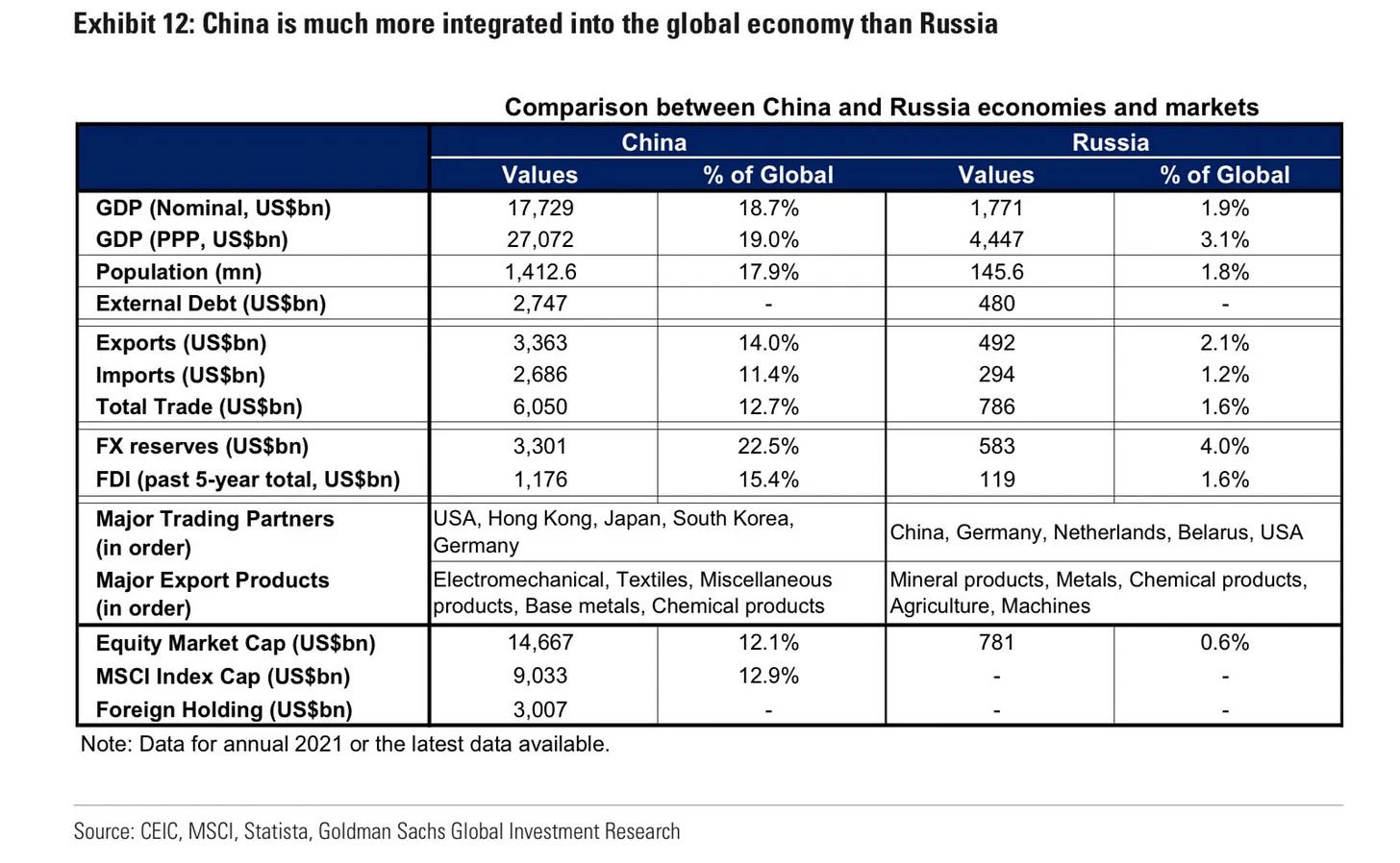 Compare China's influence on international trade and currency markets compared to its neighboring brother Russia: