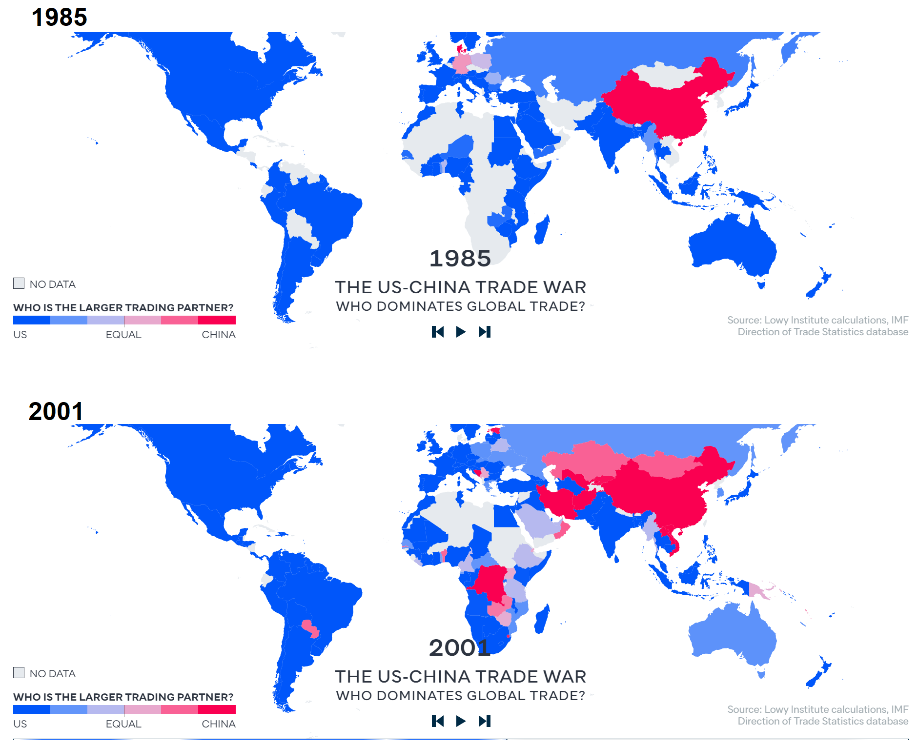At the time China joined WTO (World Trade Organization) in 2001, the US was still the important trading partner of 80% of countries worldwide.
