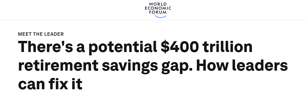 Diễn đàn Kinh tế Thế giới ước tính rằng đến năm 2050, khoảng cách giữa nhu cầu thu nhập khi nghỉ hưu và lượng tài sản thực tế được tích lũy để chi trả có thể lên tới 400 nghìn tỷ USD – nhiều lần quy mô của nền kinh tế toàn cầu hiện tại.