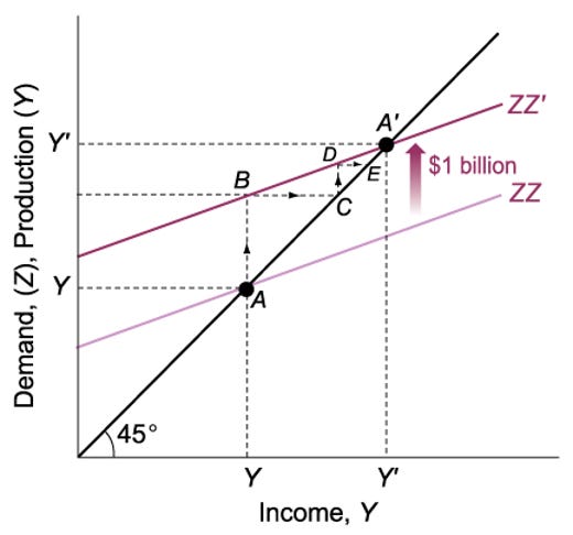 , I, G) or a decrease in tax (T) will cause Demand (Z) to increase even higher.=> Consequently, businesses adjust equilibrium output (Y) to increase: A => A’ (and nominal income also higher)Output increases → Income increases → Demand increases → Output increases → …