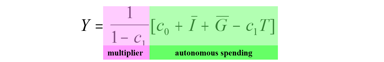 + c=> Consequently, businesses adjust equilibrium output (Y) to increase: A => A’ (and nominal income also higher) * (Y - T) + I + GZ = Y Effect of increasing Autonomous spending on Output:It can be seen that the above formula consists of 2 main parts: Multiplier (Multiplier - pink)