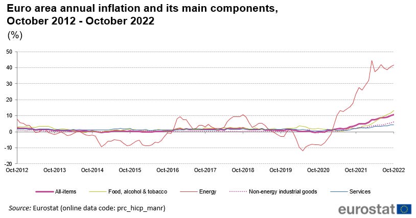 Inflation in the US has shown clear signs of cooling; however, across the Atlantic, Europe is still suffering from continuously escalating inflation reaching double digits in October.