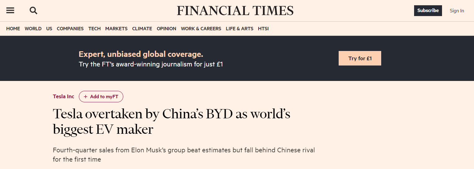 Despite record Q4 vehicle sales, Tesla's position as the world's largest EV maker has recently fallen to BYD - Chinese EV producer