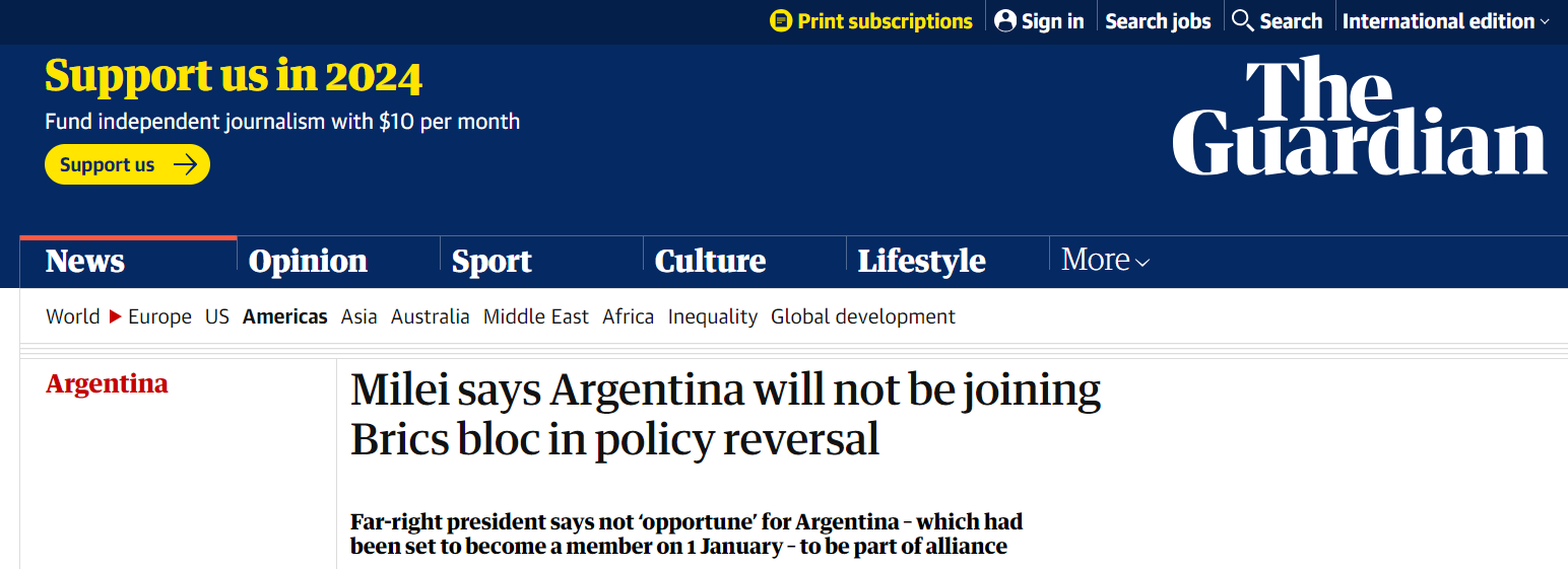 Previously, Argentina's new president Javier Miley has officially notified BRICS member country leaders that the country will not join BRICS.