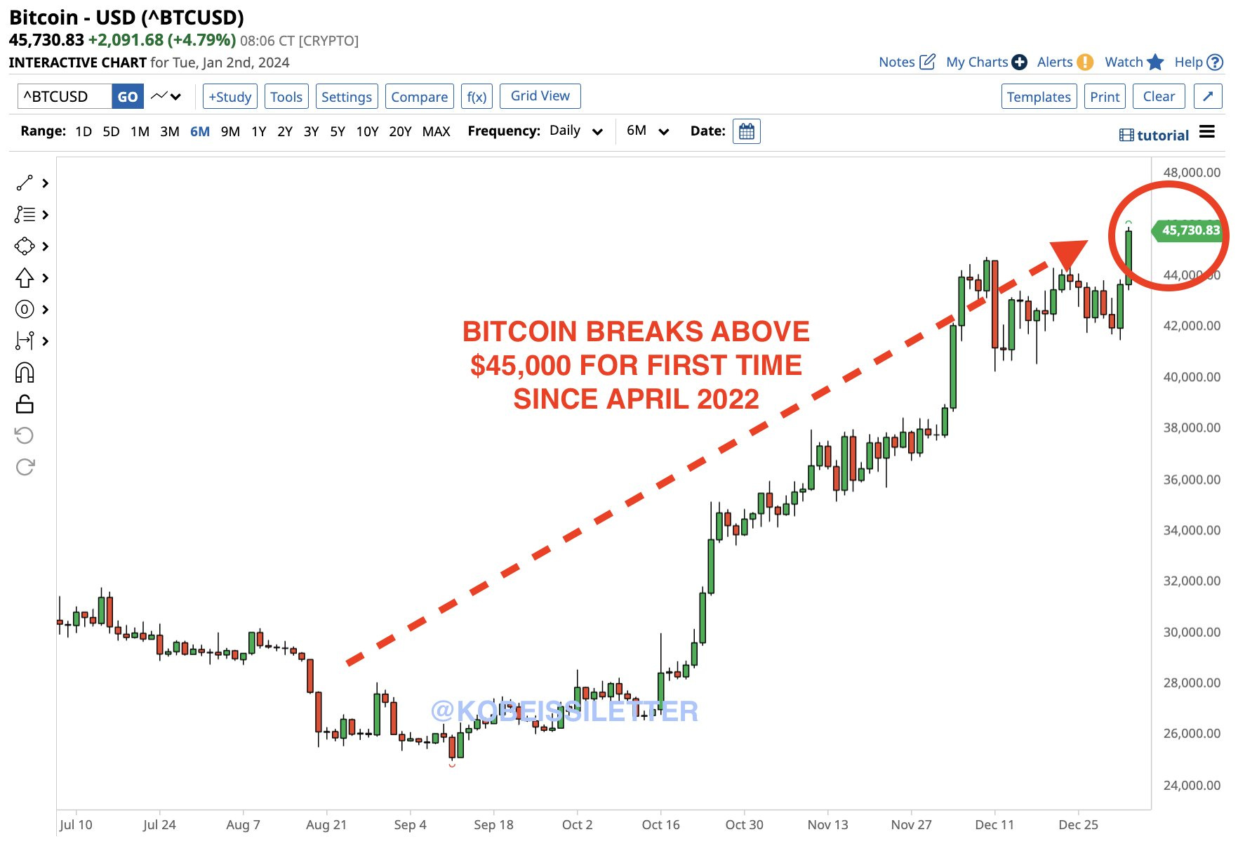 Bitcoin now trading above 45,000 USD for the first time since April/2022.