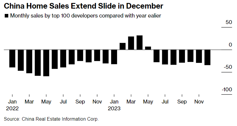 December new home sales of China's top 100 real estate companies fell -34.6% Y/Y to 451.3 billion RMB (64 billion USD).