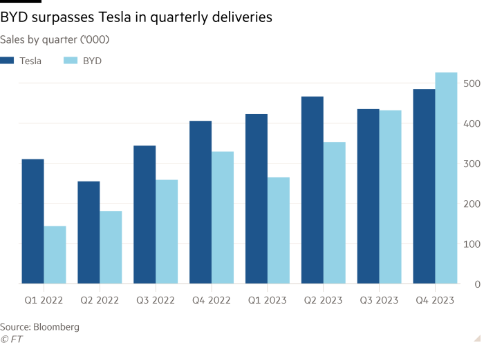 BYD's Q4 deliveries reached 526,000 vehicles — first time BYD surpasses Tesla in quarterly sales.