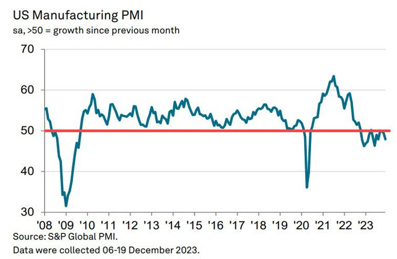 In 2023, only 2 months of S&P Global manufacturing PMI data were not in contraction territory, including December:
