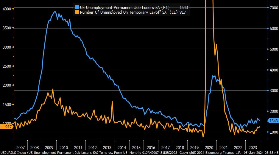 Number of people permanently losing jobs decreased in December while the number of temporary layoffs increased slightly