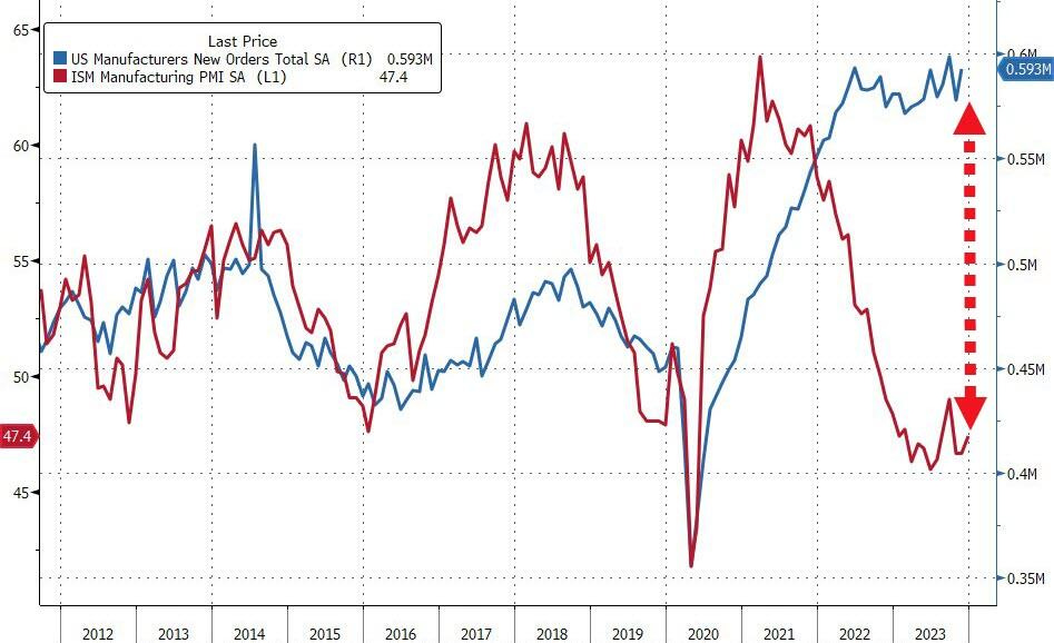 Notably, while factory orders increased, the ISM Manufacturing index fell sharply