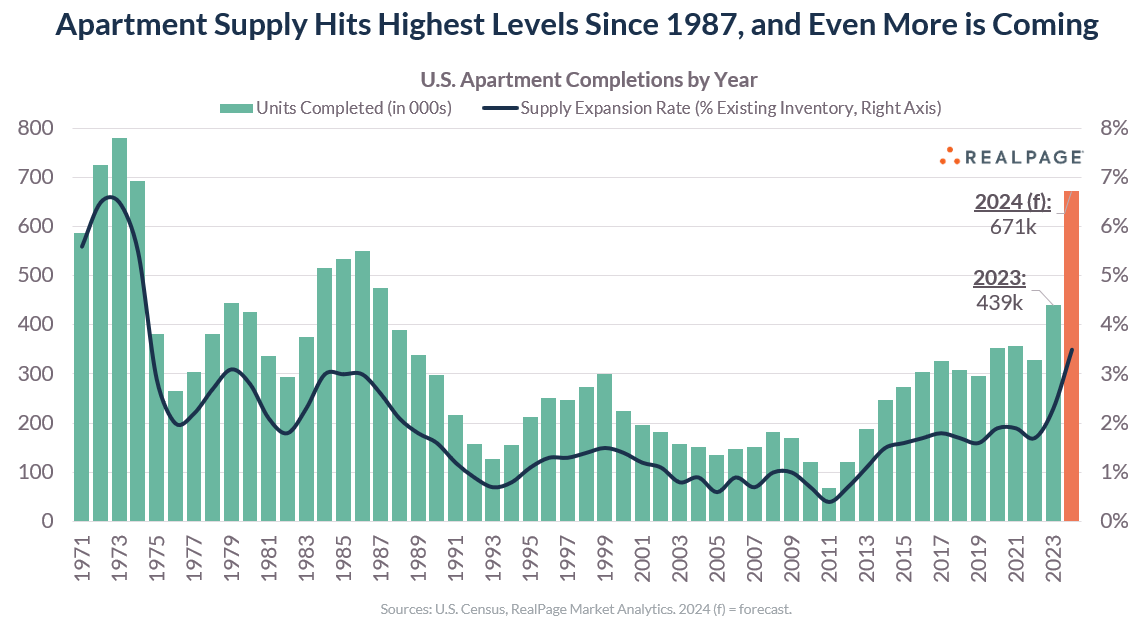 This may be due to US apartment supply in 2023 reaching the highest level since 1987, with over 439,000 units completed. More to be completed in 2024.