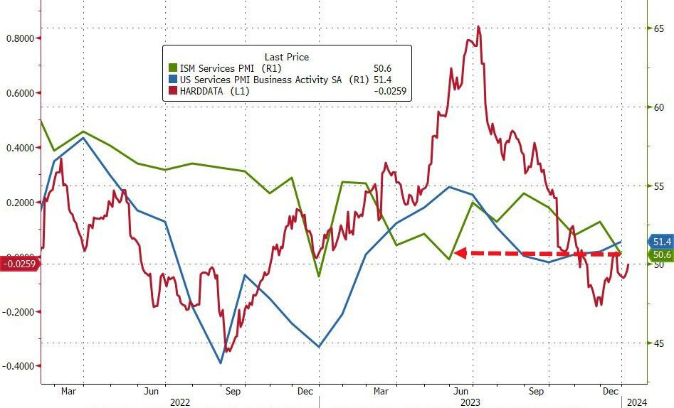 Despite the acceleration of yesterday's Services PMI, ISM Services in December fell from 52.7 to 50.6 - the lowest since May/2023