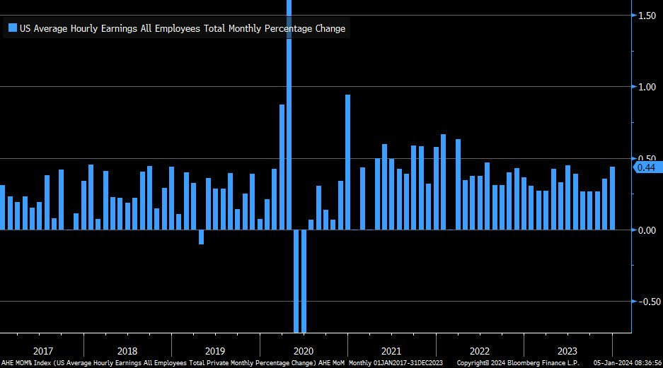 Month-over-month, average hourly earnings in December increased +0.44% M/M — the strongest increase since June last year