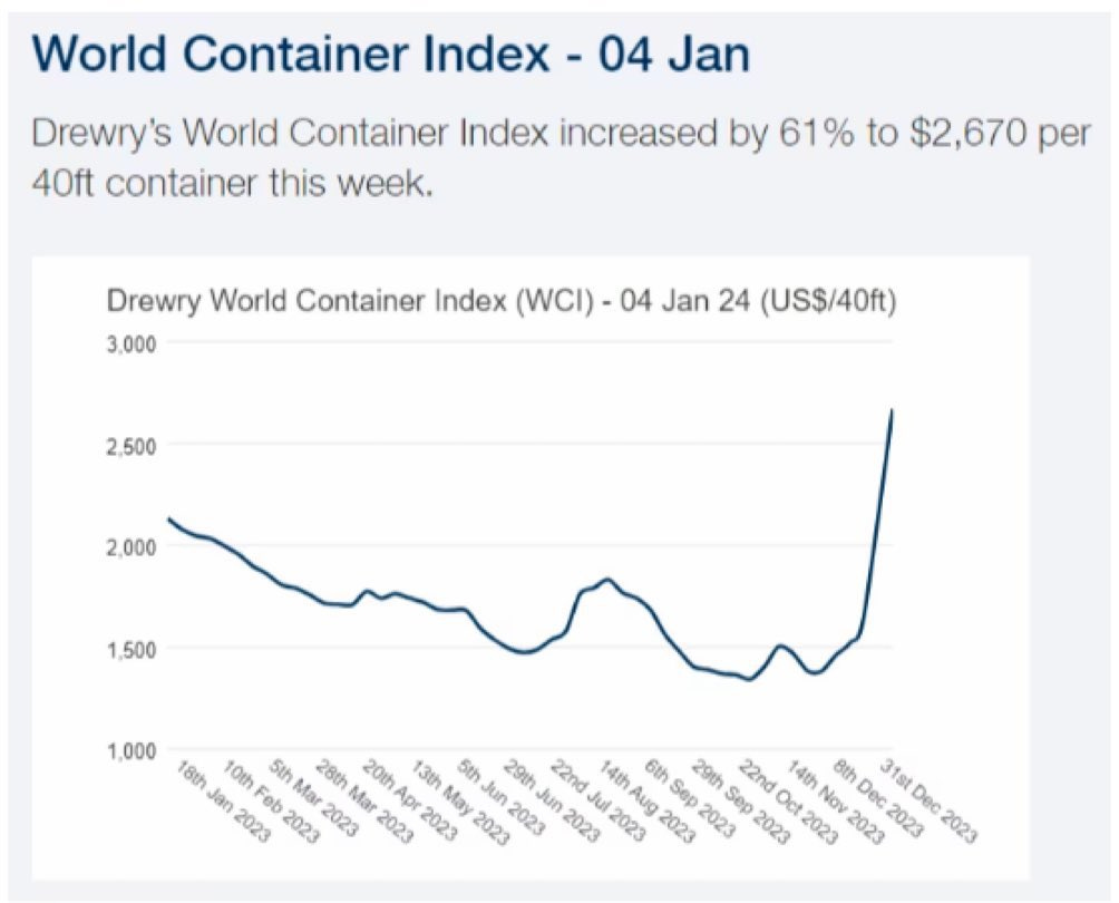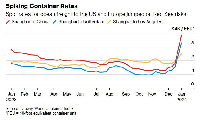On the other hand, spot container shipping rates up 173% due to threats in the Red Sea