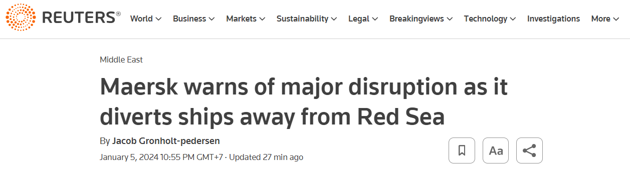 Maersk continues to change its decision from last week: now will reroute all ships via Cape of Good Hope to avoid the Red Sea route.
