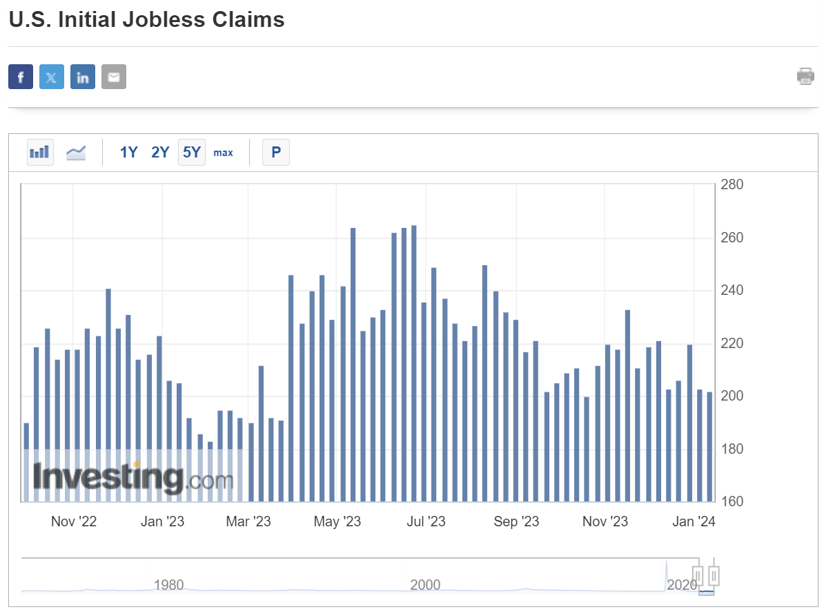 Initial unemployment claims for the past week reached 202,000 (expected 210,000).