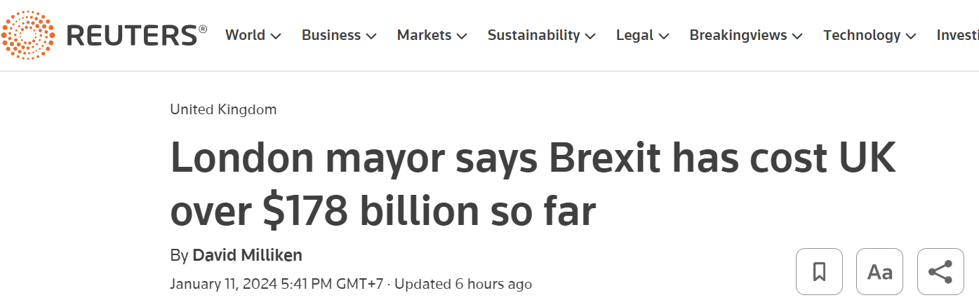 London Mayor says Brexit has cost the UK more than 178 billion USD to date.