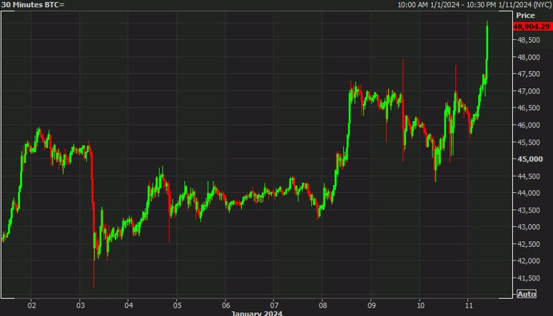 Bitcoin price nears 49,000 USD after ETF frenzy.