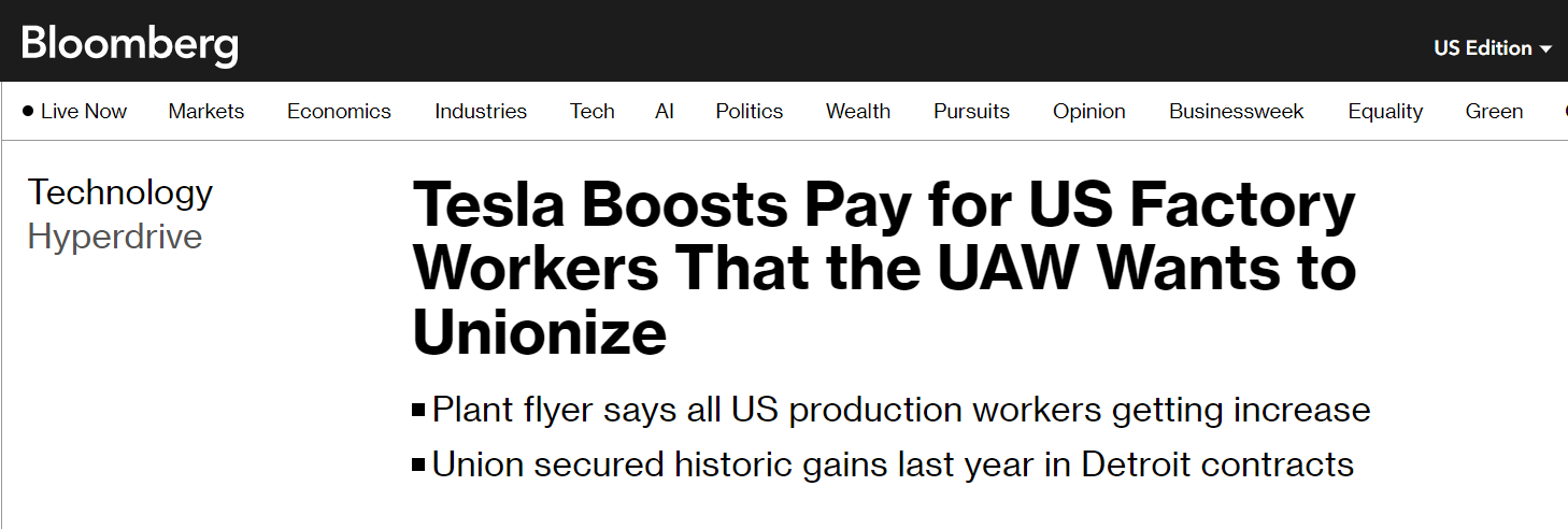 - a move warmly welcomed by the UAW auto workers' union (although Tesla's workforce is not yet affiliated with the union).