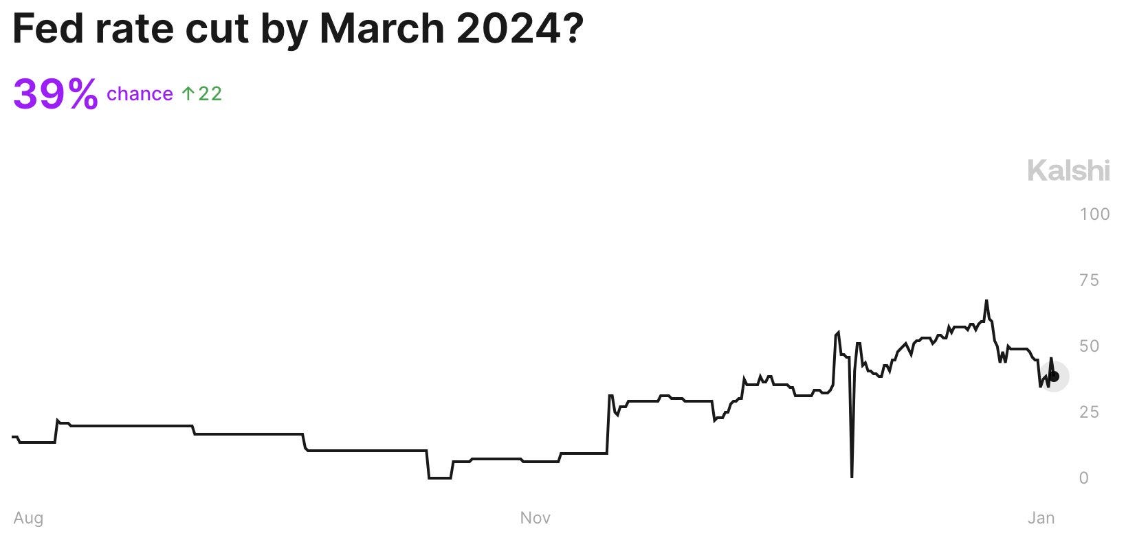 Market expectations for a Fed rate cut in March are dropping sharply: down to 39% (from 70% at the start of 2024).