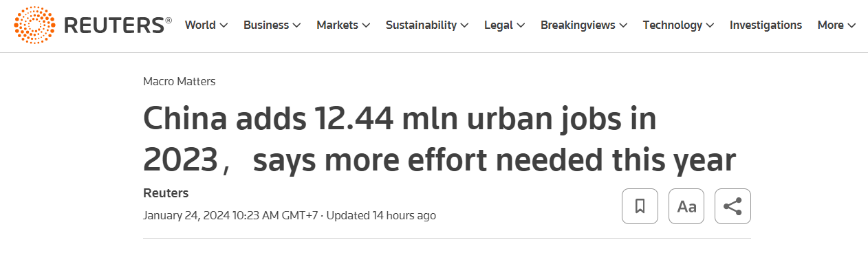 In addition, China added +12.44 million urban jobs in 2023, meeting the set target.