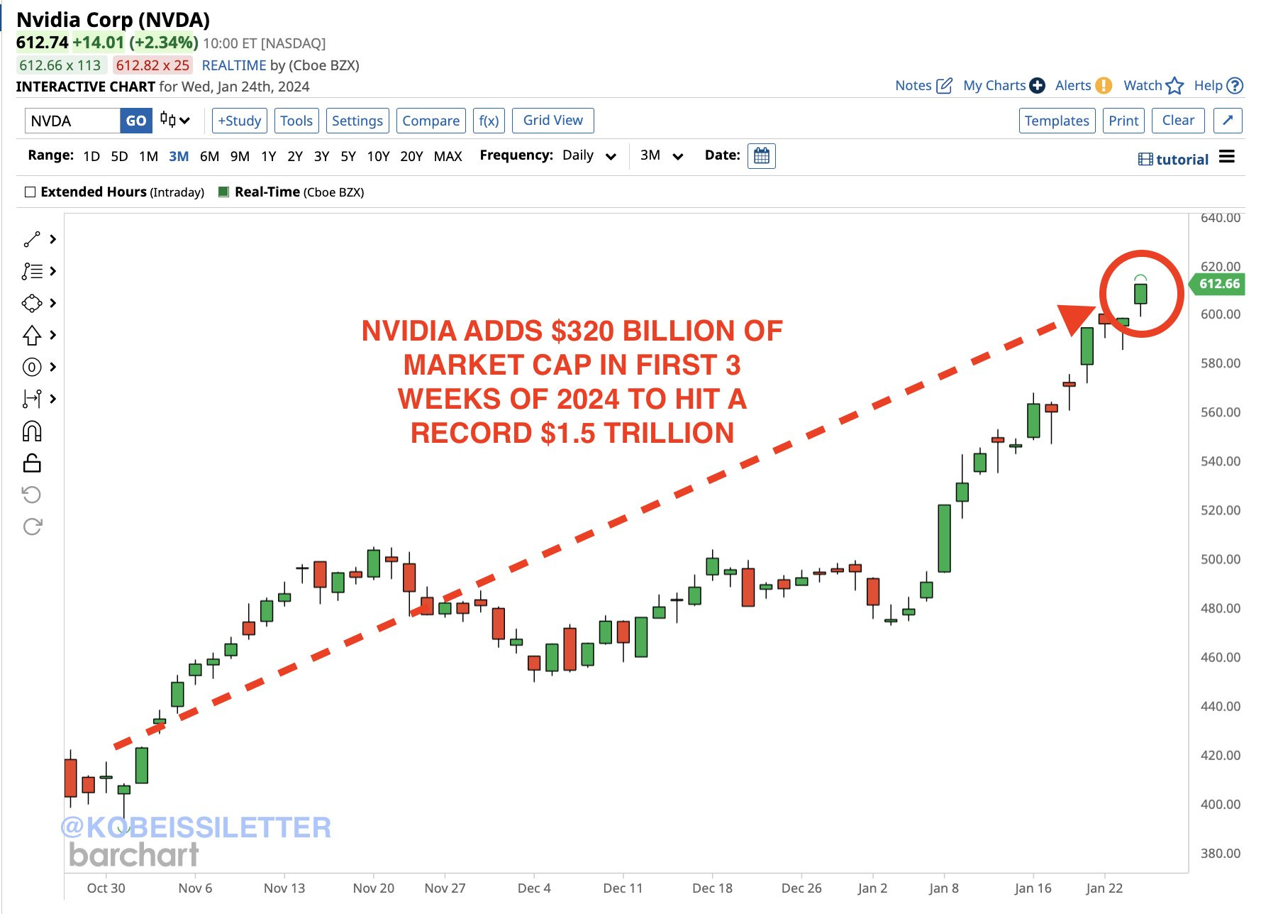 Nvidia, officially reaches record market cap: 1.5 trillion USD and +27% (+$320B) in the past 3 weeks.