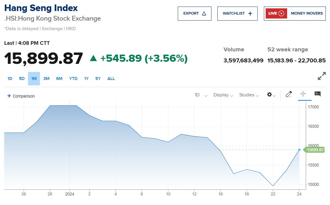 Hang Seng China Enterprises Index achieves the largest two-day gain since November 2022 (following positive policy news over the past 2 days).
