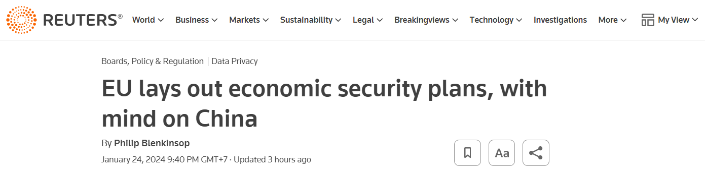 European Commission unveils economic security plan: tight monitoring of foreign investment, exports, and technology flows, especially with China.