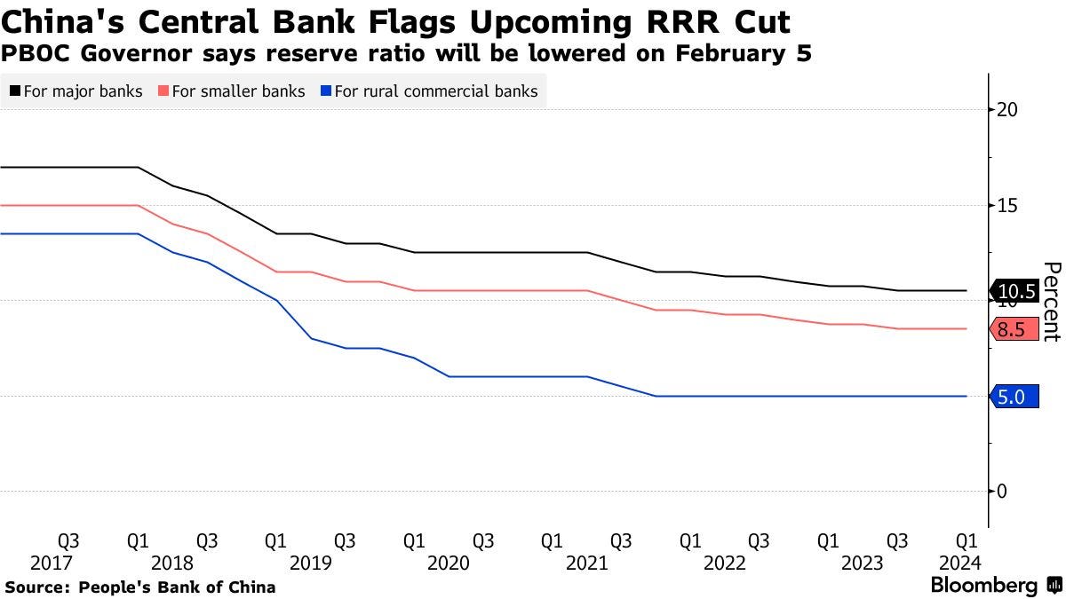 PBOC cuts reserve requirement ratio (-0.5%) for banks starting 02/05 to stimulate growth.