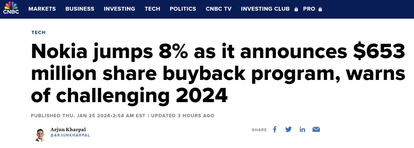 Nokia stock up 8% on 653 million USD share buyback announcement, after reporting 2023 profit decline.