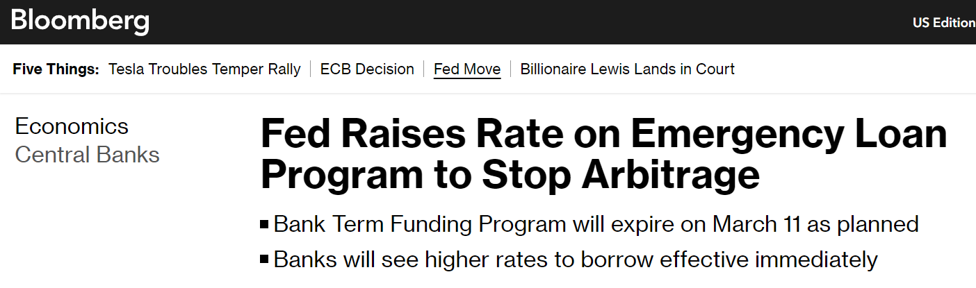 Fed confirms stopping BTFP from 03/11, after recent surge in loans, as banks exploit price spreads (arbitrage).
