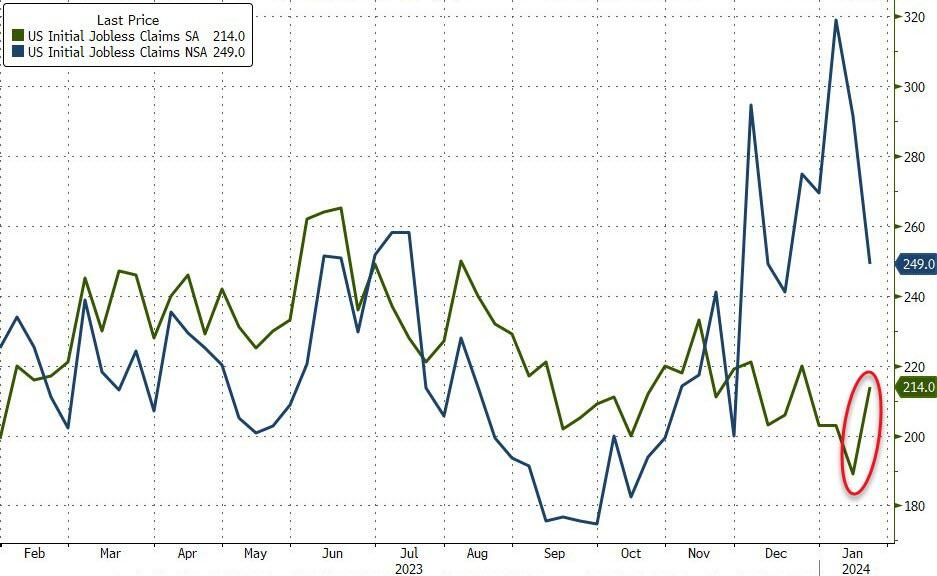 After nearing the lowest level in 54 years last week, initial jobless claims surged up +214,000.