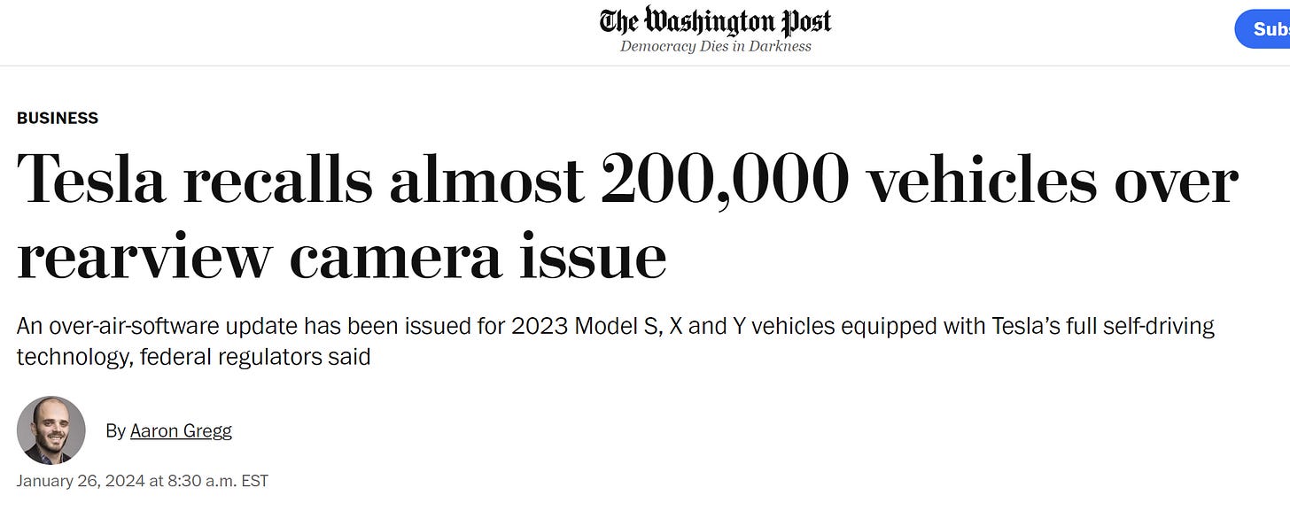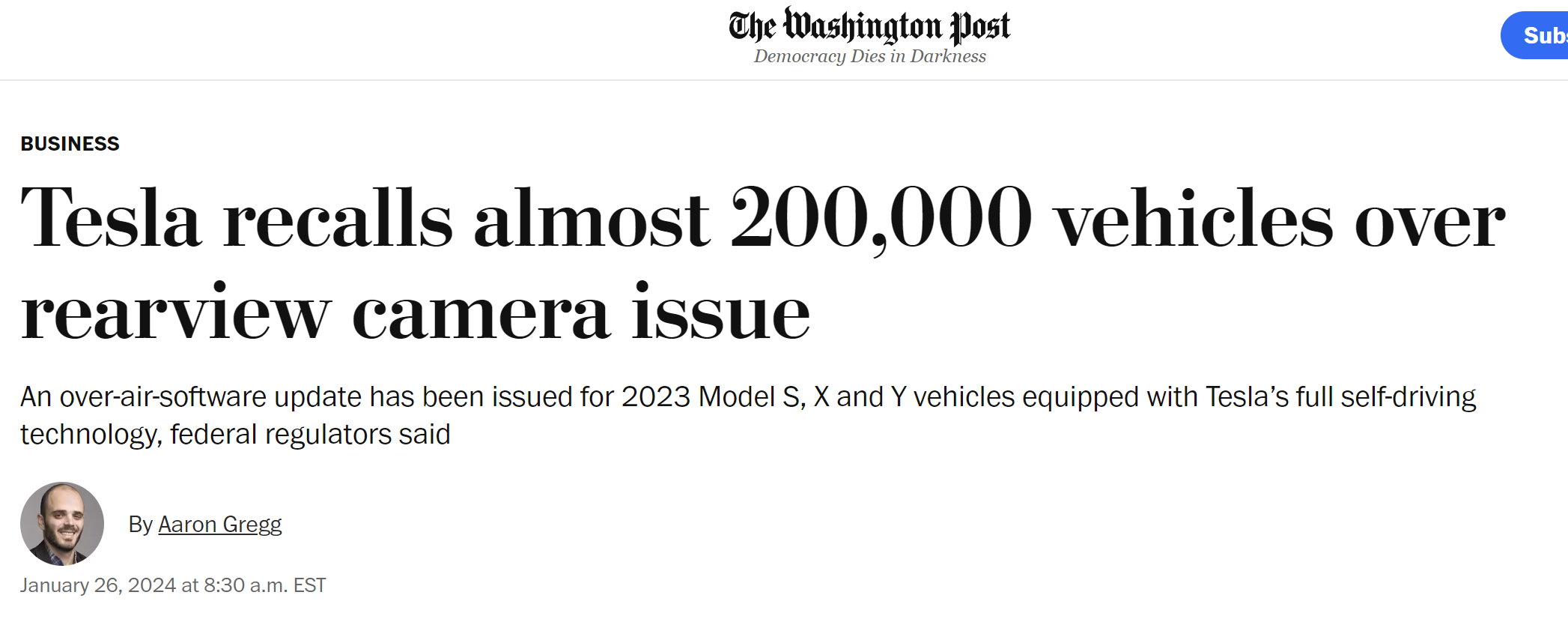 Tesla recalls nearly 200,000 Model S, X, and Y vehicles in the US due to rearview camera failure.