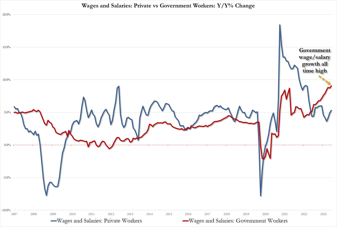 In which the level of government wage increases is at record high, significantly different from private sector.