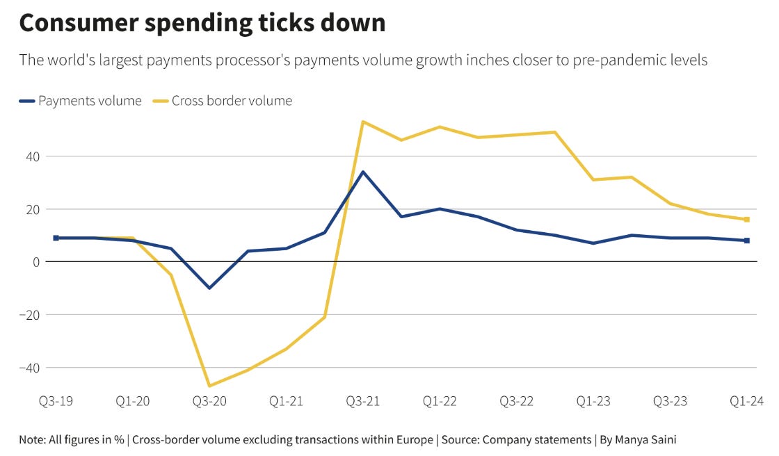 However, VISA's outlook is affected by concerns slowing economic growth + high interest rates pressuring consumers, especially low-income individuals. → Q2 sales forecast bleak.