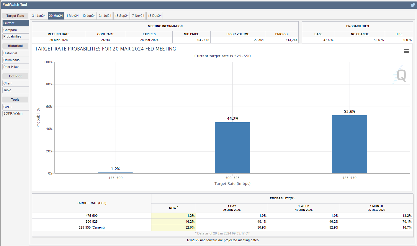 Market reduces expectations for Fed rate cut from March: down from 70% last month to about 46% currently.