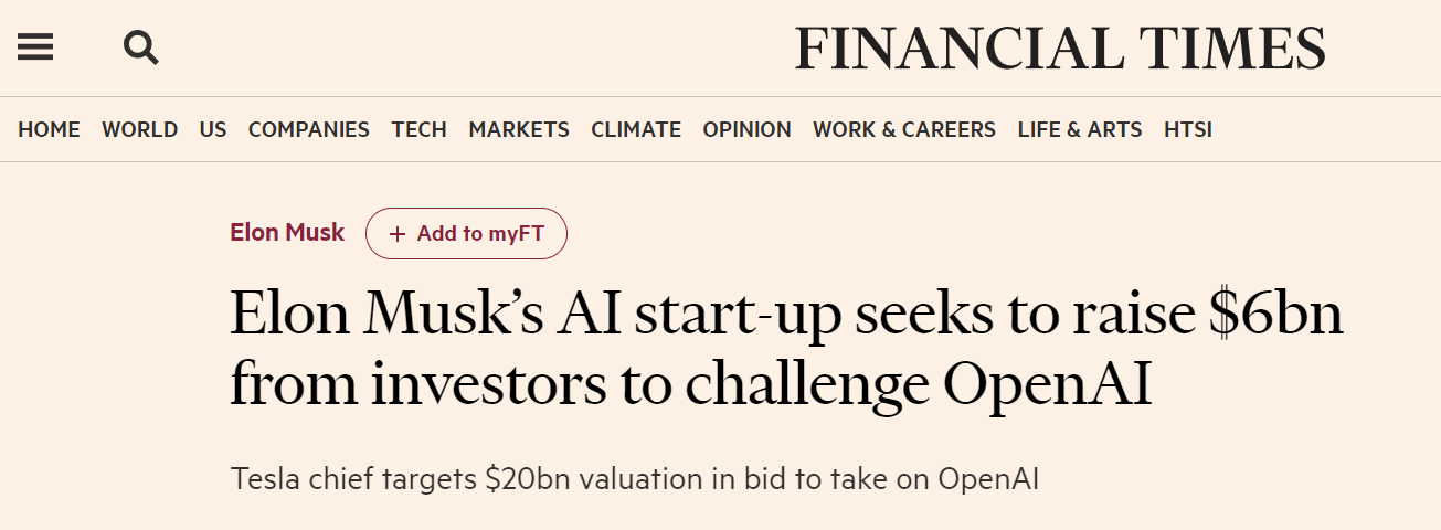 Elon Musk's AI startup aims to raise 6 billion USD at a proposed valuation of 20 billion USD to compete with OpenAI.