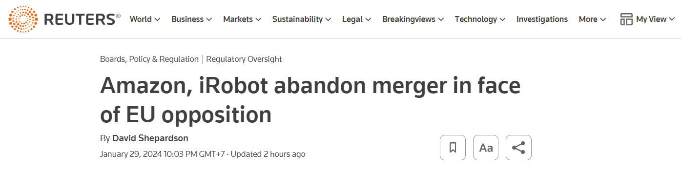 Amazon and iRobot terminate merger plan due to opposition from EU antitrust regulators.