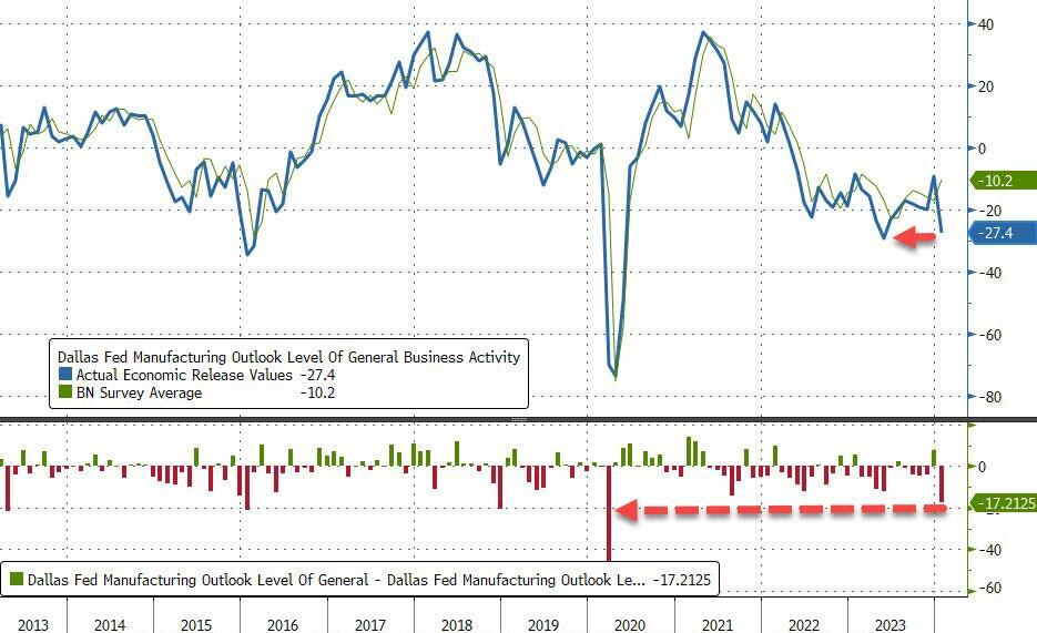 Dallas Fed Manufacturing Outlook index drops from -9.3 to -27.4 (much lower than expected -11) - back to post-COVID lows.