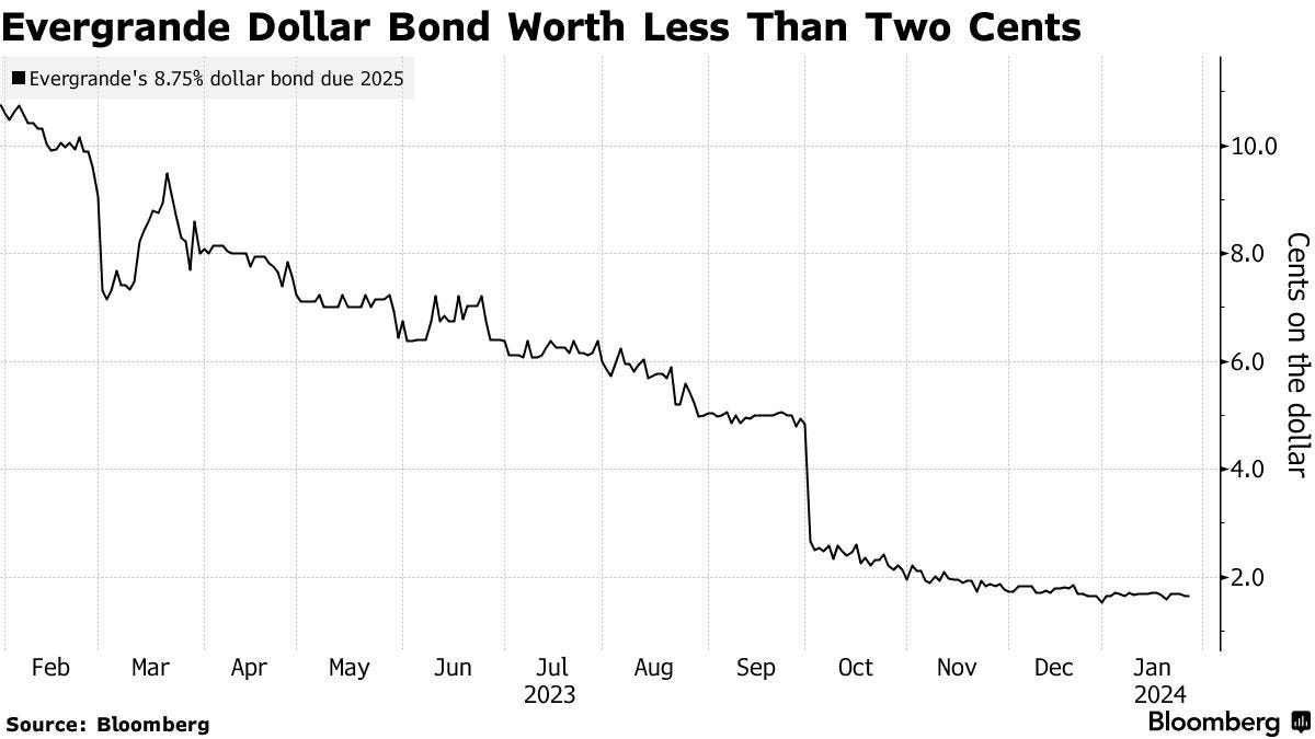 Evergrande's USD-listed bond valuation down to ~1.5 cents → market pessimistic about debt repayment ability.