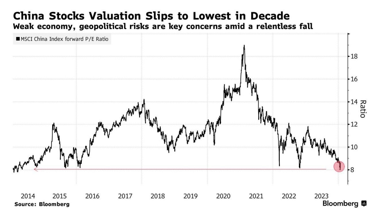 P/E of Chinese stocks drops to 8 - lowest valuation in a decade