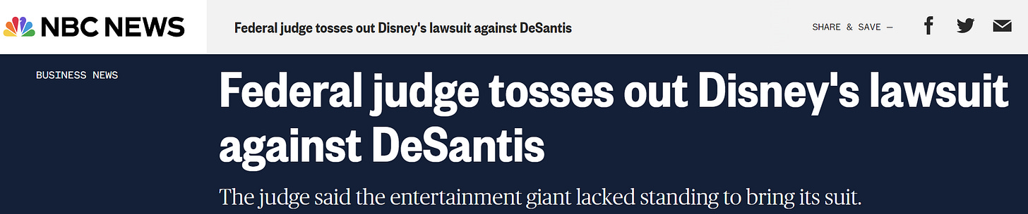 Federal judge dismisses Disney's lawsuit against DeSantis, ruling Disney lacks standing to sue.