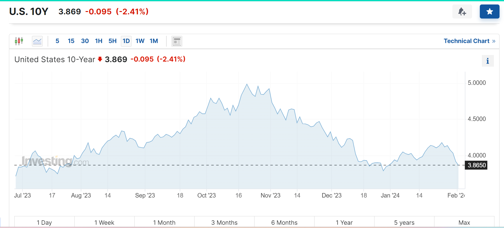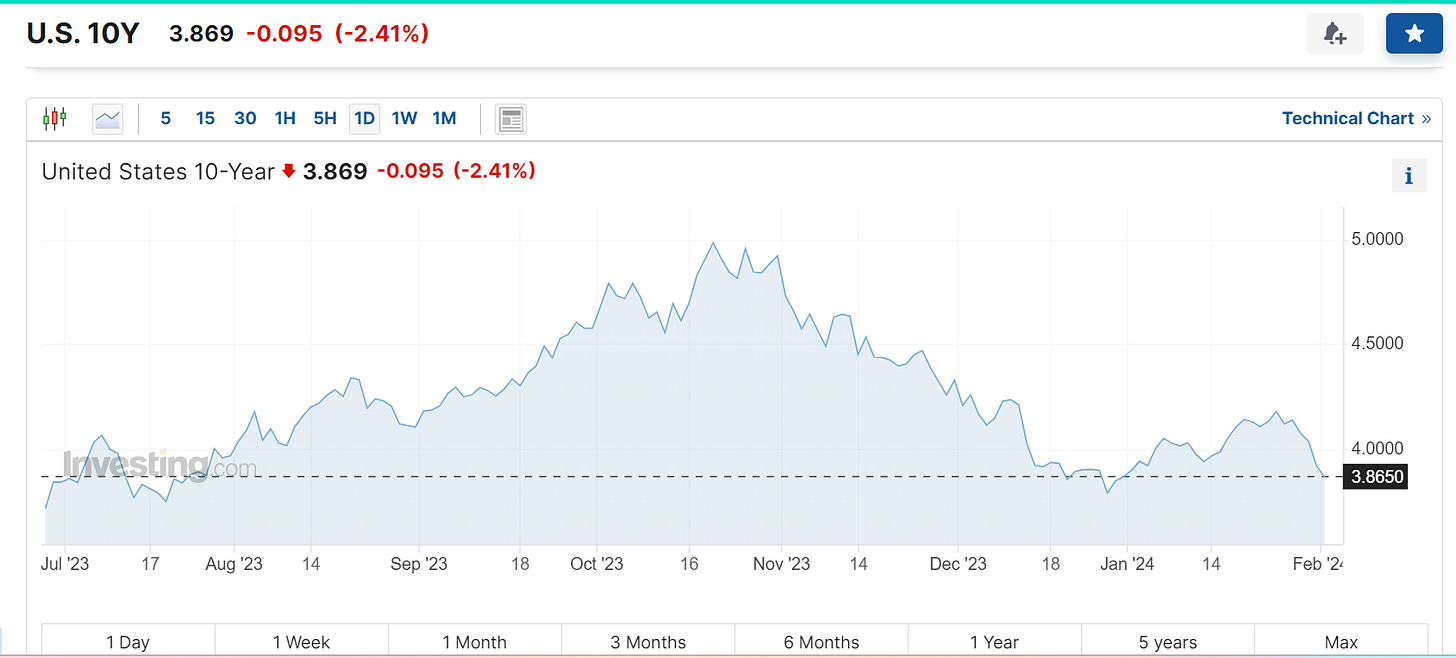10-year Treasury yield falls below 3.9% for the first time this year: