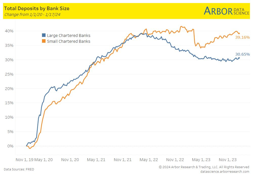 Over the past 4 years, deposits at small banks have grown strongly compared to large banks.