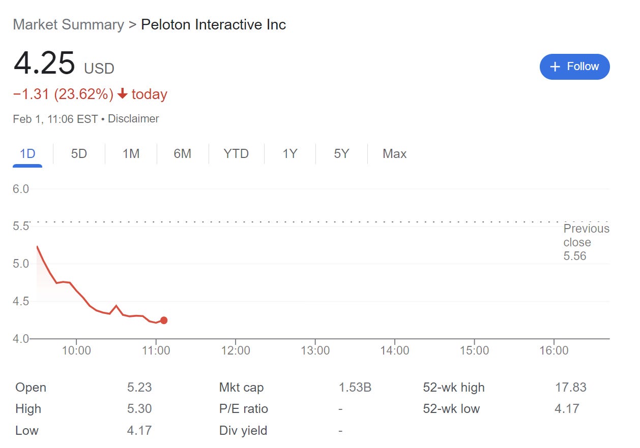Peloton shares drop more than 20% in morning trading.