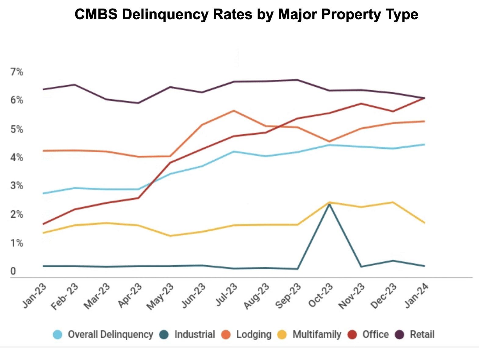 Office delinquent debt ratio increased +48bps this month to 6.3%.