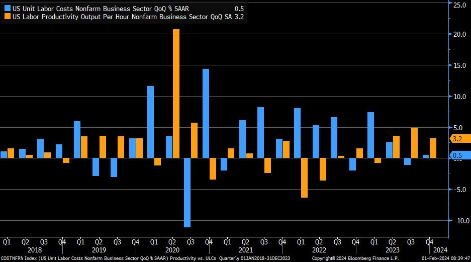Hourly nonfarm productivity rose +3.2% YoY, (Q3 also revised up to 4.9% ).