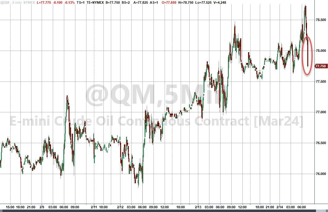 WTI fluctuates around 78.25 USD before official data and begins sharp decline afterward.