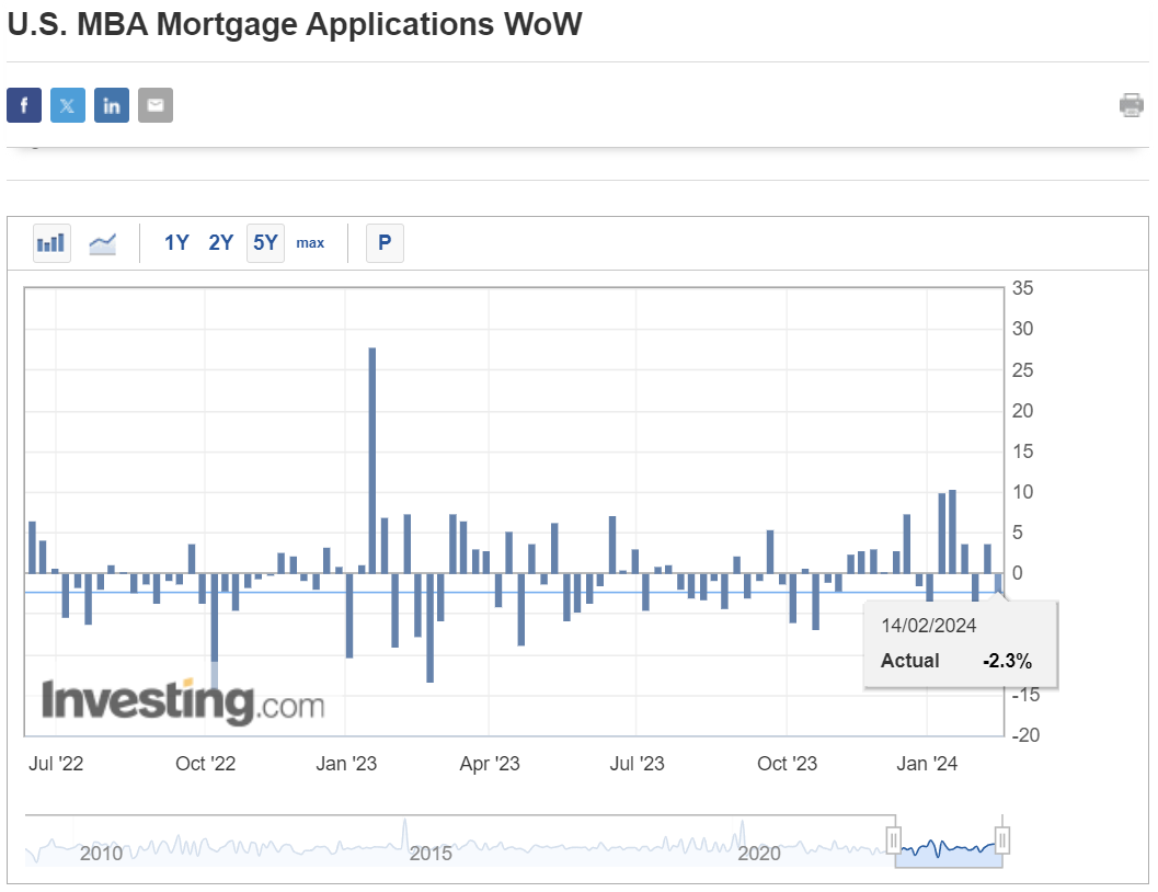 MBA mortgage applications decline -2.3% (prior: +3.7%) as both new home purchases and refinance activity declined.